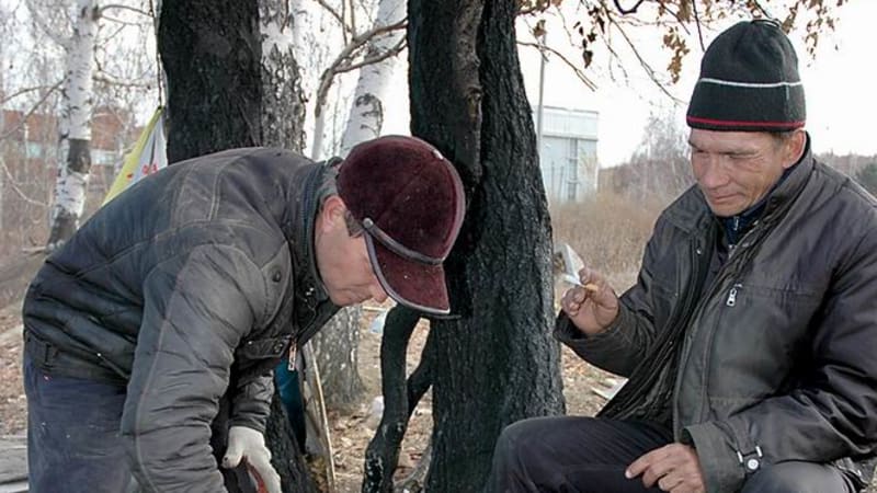 Пожилая женщина, что-то помешивающая на костре в большой консервной банке, никак не реагирует. Молодой парень в зелёной лыжной шапочке с надписью «Сибскана» тревожно выглядывает из кустов, но ближе не подходит. К участковому приближаются «старшие» – Олег, Санёк и Иваныч. Одеты грязно, но не без шика: на Саньке поношенная норковая бейсболка.