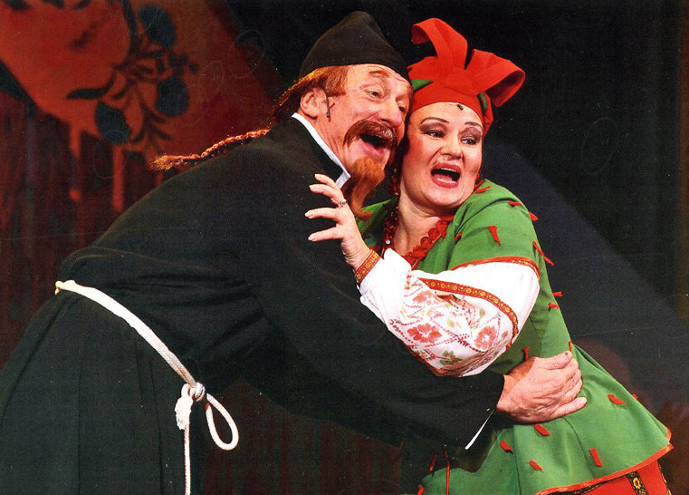 Конечно, оперетта – о любви, возникшей стремительно, развивающейся бурно и победоносно завершающейся. Герои этой любви – Парася и Грицко – симпатичные и обаятельные, но в них, на мой взгляд, мало сегодня того любовного накала, той всеобжигающей страсти, что и составляет их героический дуэт. Оперетта, как всегда, выигрывает за счёт второстепенных и условно отрицательных персонажей. В центре актёрских удач – колоритная Хивря в талантливом воплощении Елены Бондаренко. Мы не раз отмечали её удивительное ощущение жанра, её оглушительный темперамент, умение превращать каждую встречу со зрителем в любом образе в фейерверк поз и интонаций. Вот и в нынешней «Сорочинской ярмарке» актриса убедительно демонстрирует весь арсенал своего редкого в театре оперетты таланта.