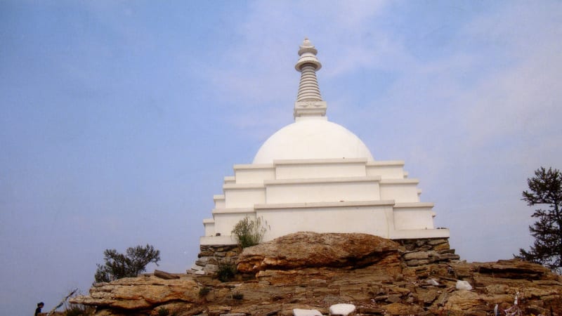 Направление держим к месту массового паломничества – острову Огой. Вдали, на вершине высокой горы, – белеющее сооружение. Вроде бы «маяк». Он словно манит к себе. Расстояние скрадывает вода. Плывём уже часа полтора, а «маяк», кажется, и не приближается, хотя «Пилигрим» идёт полным ходом. Наконец пристаём к берегу острова. К сооружению ведёт крутой и долгий подъём. Древняя лестница-тропа выложена каменными плитами. Она теперь лишь напоминает о том, что когда-то паломники поднимались только по ней. Сейчас народ идёт по натоптанной дорожке рядом. Вдоль неё по всему склону – разнообразные выкладки, сложенные из плитняка. Тоже знаки поклонения бурхану.