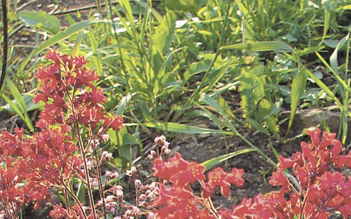 Цветение гейхеры с тёмными мелкими изящными волнистыми листьями похоже на цветение ландышей. Высокие стебельки покрыты розовыми колокольчиками. Обычно спрашивают, почему ландыши цветут летом.