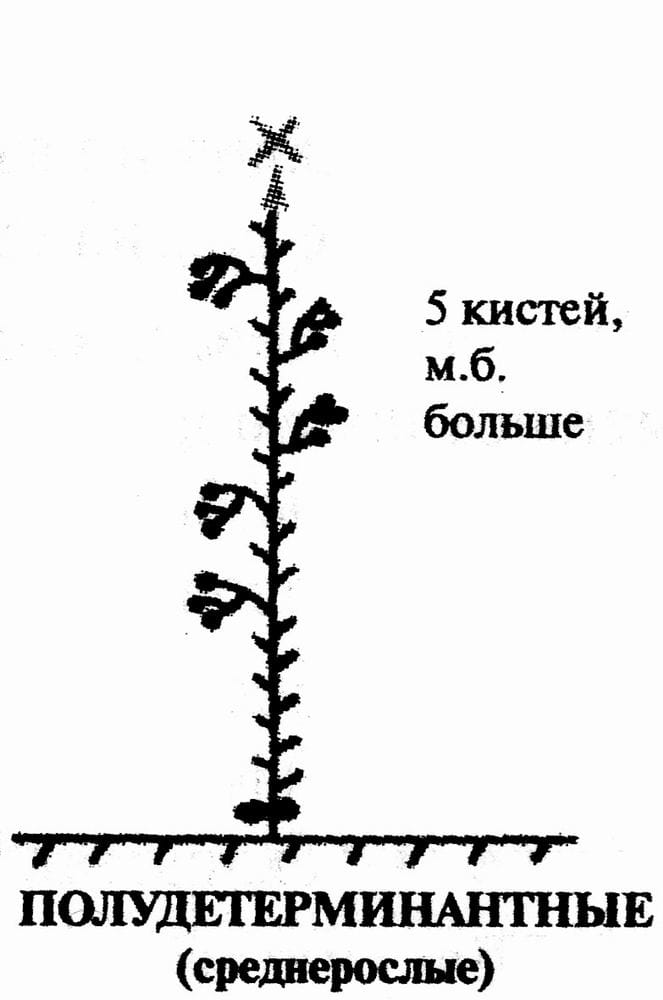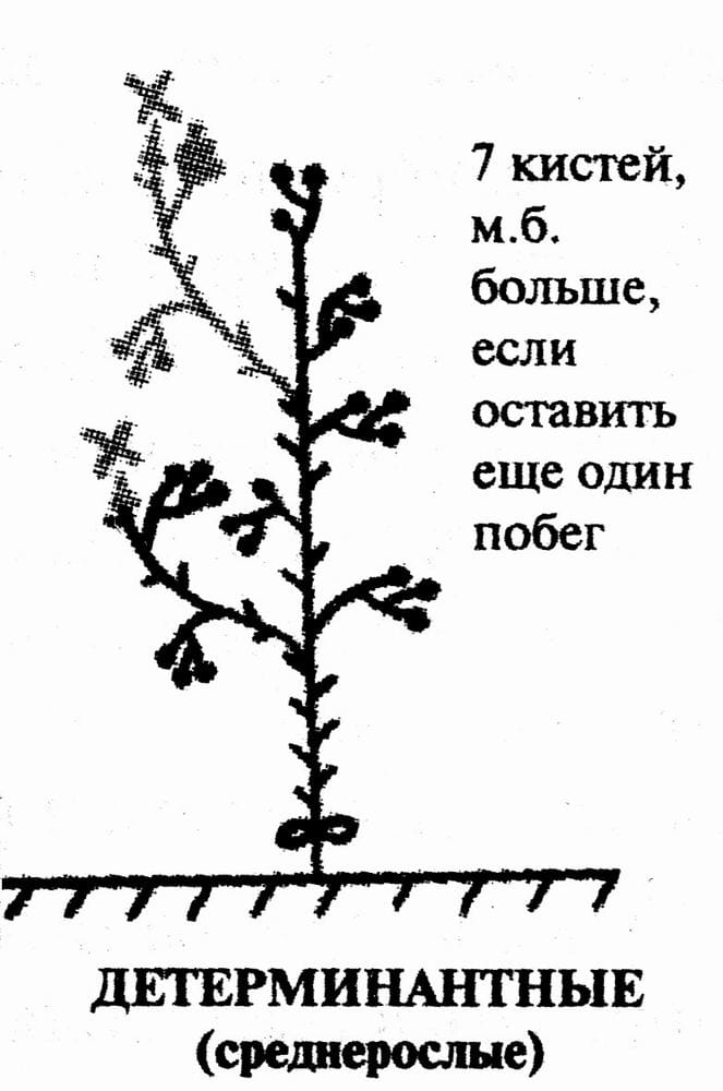 У среднерослых полудетерминантных томатов (Маргарита, Кострома и другие) главный стебель закрывается 8-9 соцветием, и обычно этого достаточно для одного растения. Поэтому у сортов этой группы удаляют все пасынки и куст формируют в один стебель, оставляя пять кистей; при хорошем уходе можно больше.