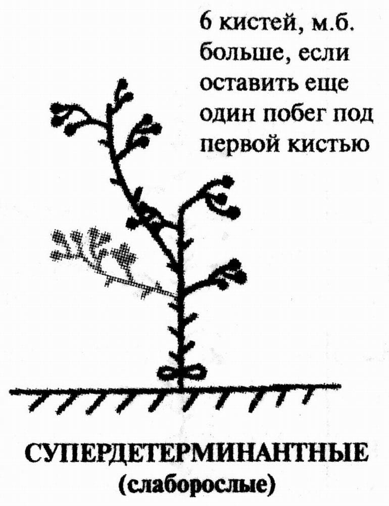 У среднерослых детерминантных сортов, гибридов (Верлиока, Ля-ля-фа, Дельта, Вентура) после образования 4–6 соцветий рост главного стебля завершается. Поэтому для продолжения роста оставляем наиболее развитый резервный пасынок под одним из верхних соцветий (называемый побегом продолжения) с таким расчётом, чтобы сформировать 5–7 соцветий. Томаты этой группы можно выращивать как в теплицах, так и под небольшим укрытием со схемой посадки 50х30–40 см.