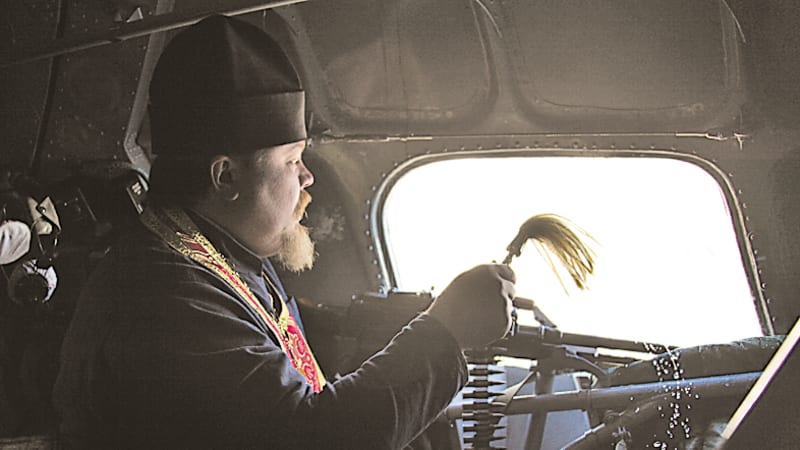 В тот приезд была заложена новая традиция: отец Николай совершил таинство крещения над несколькими бойцами и предпринял первый облёт границ на вертолёте с иконой Иннокентия Иркутского и окроплением границ святой водой. А после облёта он пришёл к пограничному начальству и жёстко сообщил, что не может оставить святую икону в таких неподобающих условиях. Часовня стояла без крыши, а в кабинетах, где проводятся оперативные совещания, стоит сигаретный чад и слышатся крепкие солдатские выражения, иконе находиться негоже. «Вот приедет священник из Моздока, посмотрит на это безобразие – и заберёт у вас икону!» – пригрозил отец Николай.