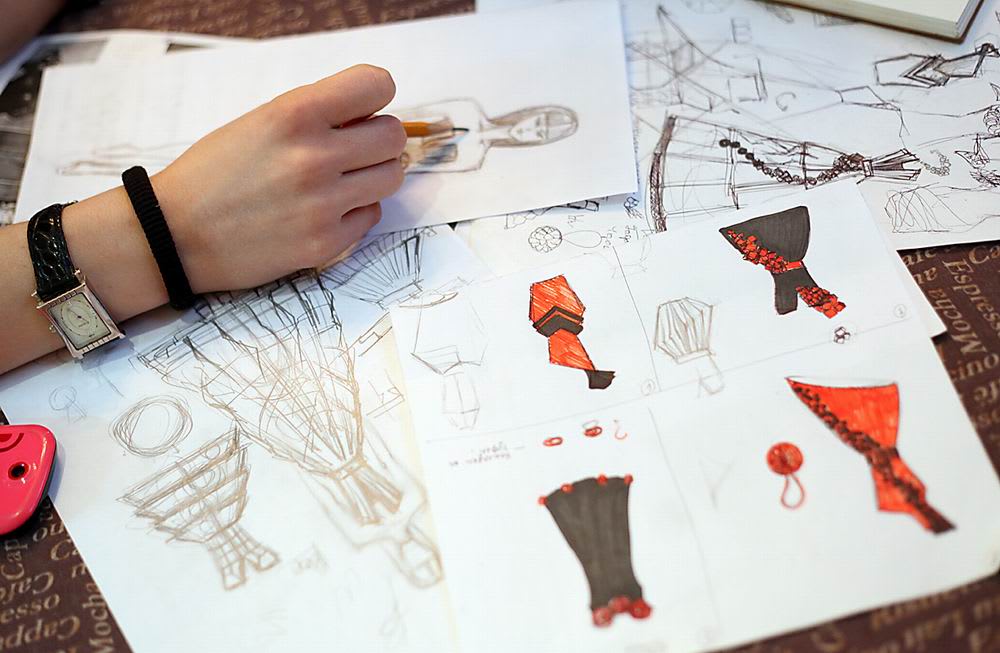 Работать над созданием одежды приходится днями и ночами. Чтобы всё успеть, девушки взяли на работе несколько отгулов. На первый взгляд, говорят они, будет непонятно, что платья, юбки и жакеты сделаны не из ткани. Однако чтобы добиться такого эффекта, нужно серьёзно потрудиться: бумага оказалась сложна в работе. Но модельеры не боятся трудностей, тем более что опыт работы с таким капризным материалом у них есть. За шесть лет обучения на архитектурном факультете они склеили так много макетов, что бумага стала им почти родной. Коллекция разрабатывается в чёрно-красно-белой гамме, в ней присутствуют жёсткие корсеты, льющиеся юбки, шляпки, сумочки, украшения для волос и другие аксессуары. Одежду украсит множество деталей: кубы, цветы, скреплённые между собой геометрические фигуры. Костюмы объединит футуристическая идея.