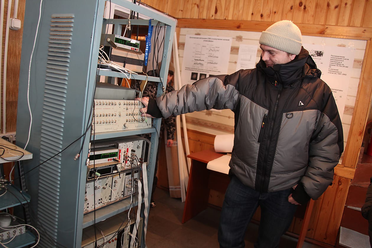 Александр Белецкий, научный сотрудник лаборатории физики нижней и средней атмосферы, как раз тот, кому интересно. Он ведёт нас к оптикам. Здесь группа учёных с 80-х годов занимается «собственным свечением верхней атмосферы земли». График работы такой: ночь дежуришь, днём спишь. За одну ночь приборами записывается около 30 гигабайт данных. «У нас установлена аппаратура, регистрирующая излучение ночного неба в различных диапазонах спектра – от ультрафиолетового до инфракрасного, – рассказывает Александр Белецкий. – На высотах больше 80 километров наблюдается оптическое излучение, обусловленное хемилюминесценцией. Иногда, во время больших геомагнитных бурь, на широте Иркутска можно наблюдать среднеширотные сияния, во многом подобные полярным сияниям. В начале 20 века при наблюдении полярных сияний были выявлены основные эмиссионные линии атомарного кислорода: зелёная, с высотой высвечивания около 100 км, и красная с высотой около 250 км. Зачем наблюдать это? Чтобы изучить состояние атмосферы. Потому что она реагирует подчас на события, происходящие даже в глубинах земли.