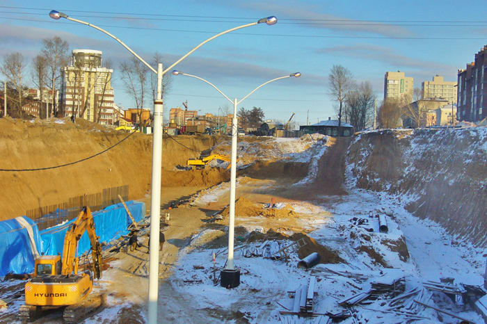 Продолжается также перекладка инженерных сетей, канализации, разработка котлована основного хода. На сегодня  из 400 метров пройдено более 100, на земляных работах задей-ствовано три экскаваторных комплекса, два мощных бульдозера, десяток самосвалов.