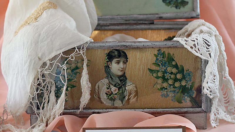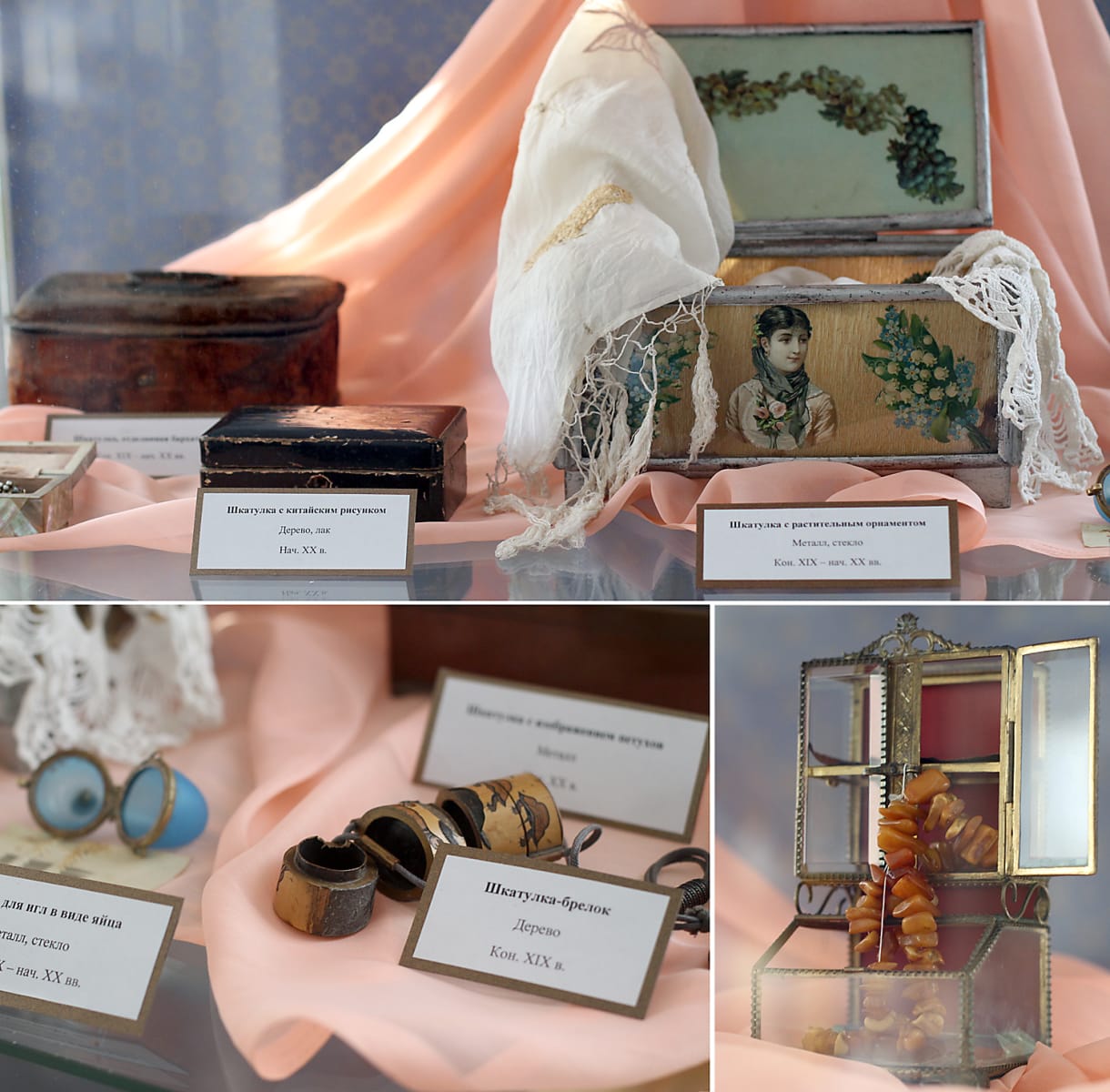 Особняком стоят шкатулки для ювелирных изделий. «Мы специально отобрали металлические шкатулки со стеклянными вставками. Такие шкатулки были в моде в первой половине 20 века, – рассказывает Андрей Кожухарь. – Они были прозрачными, чтобы хозяйка могла видеть, какие украшения внутри». Делали также шкатулки самых причудливых форм, к примеру в виде миниатюрного шкафчика, напоминающего дамский комод.