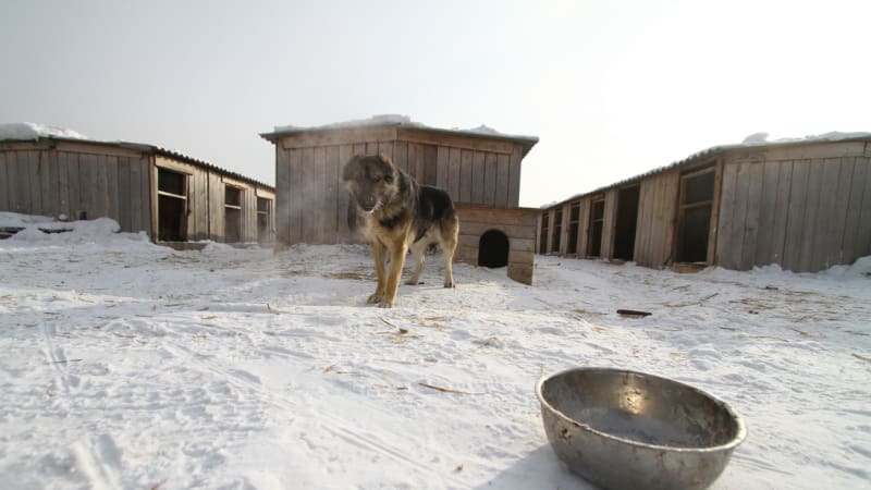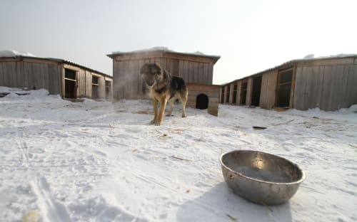 Одновременно здесь содержатся около двухсот собак. В небольших деревянных вольерах, расположенных в шесть рядов, они живут по одной-две. В помещениях побольше для них сколочены ящики, туда стелют тряпьё и солому. Есть скрытая за забором и оборудованная отдельным входом зона карантина. Туда помещают только что прибывших собак, которых нужно проверить на наличие заразных заболеваний. В железных мисках — превратившаяся в лёд геркулесовая каша и снег. «Они его лижут, когда пить хотят», – поясняет Александр. Увидеть, как собаки лижут снег, нам не довелось. Все они с такой радостью встречали гостей и пытались обратить на себя внимание, прыгали на задних лапах и вертели хвостами, что выглядели абсолютно здоровыми и счастливыми. Только некоторые из них никак не реагировали на людей и грустно смотрели со своих соломенных подстилок.