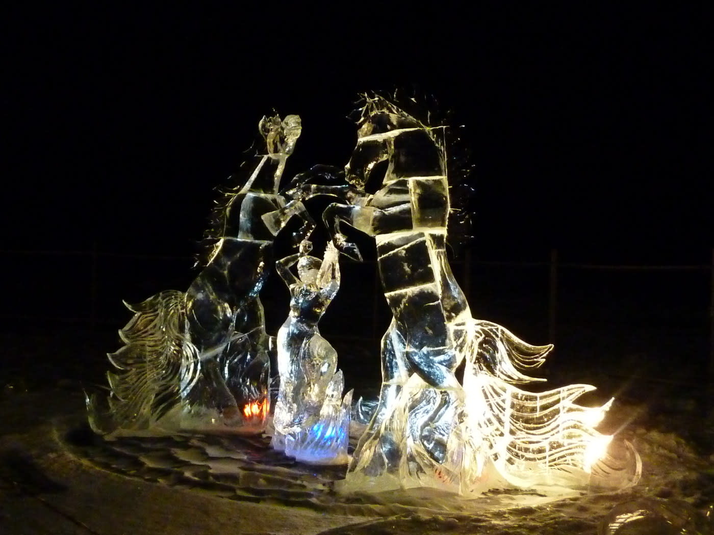 Неделю спустя «Ангара» получила бесспорное первое место за композицию «Укрощение огня». Вздыбленная пара коней и шаманка с бубном в кольце огня, пожалуй, самая «ледяная» из всех фестивальных композиций: мастера смогли и обыграть кристальную прозрачность байкальского льда, и «остановить мгновенье», и отдать дань уважения традициям народа, издавна населявшего берега священного озера.
