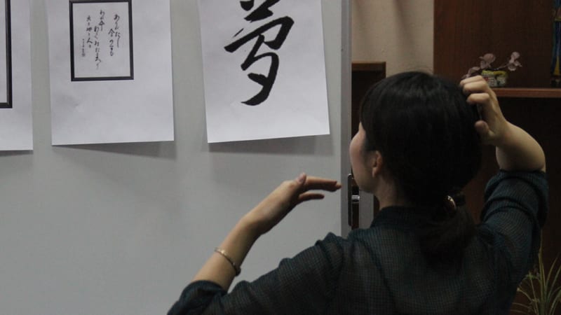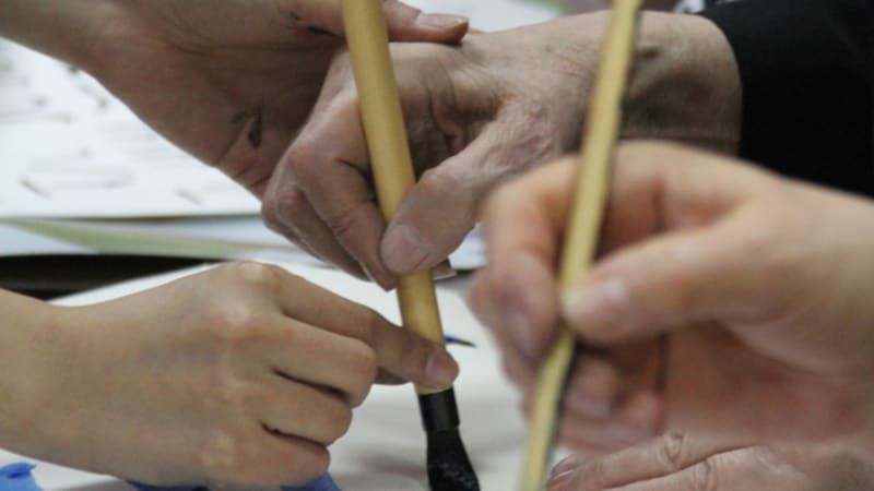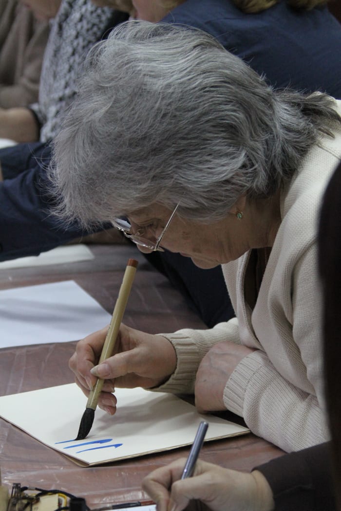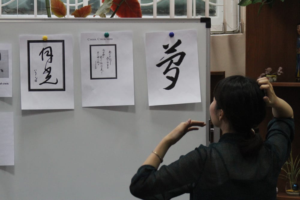 По канону лист тонкой японской бумаги для каллиграфии укладывается на специальную мягкую циновочку, рядом располагаются крупная кисть, тушь и тушечница. Циновок на всех не хватило, тонкая бумага для каллиграфии тоже досталась не всем. Но творческому настроению это не помешало. Люди расхватали офисные листки, вырвали странички из блокнотов. Кто-то даже писал на передовицах Times. Писали на столах, стульях и коленях.