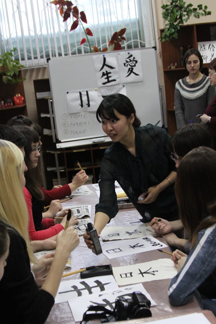 – А почему нельзя? Пропустите нас. – Когда мы зашли в библиотеку, там стояли несчастные страждущие. Им не давали номерки в гардеробе. Распоряжение сверху: мастер-класс забит, больше народ к великому сёдо, или «пути письма», не допускать. Магия Японии настолько велика, что люди, почти ничего не знающие о русской каллиграфии, битком набились на мастер-класс, чтобы приникнуть к роднику каллиграфии японской. Нам удалось прорваться, размахивая словом «журналист», священным даже для бронетанкового отряда русских библиотекарей. Маленькая сенсей Марико Койдэ, преподаватель японского языка, изящно порхала между крупными европейскими бабушками и девушками. Дамы на этом празднике письма преобладали. Хотя были и дети, а кто-то пришёл целыми семьями. Мест на всех не хватило, и часть людей стояла. Госпожа Марико подбежала к суровым библиотекарям, трогательно сложила руки и начала кланяться. «Сенсей просит сделать так, чтобы стоящие тоже могли написать что-нибудь», – сказала девушка-переводчик. Но русские библиотекари ничего сделать не могли: не ожидали такого аншлага.