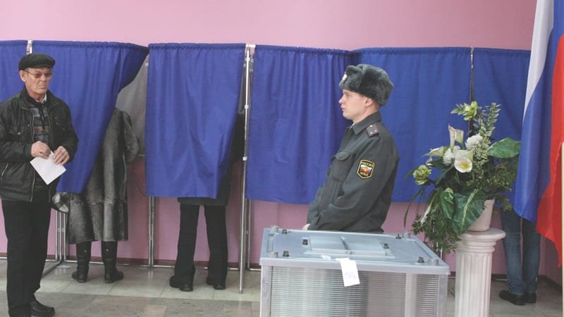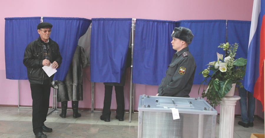 считает бюллетени – после закрытия участка техника выдала готовый протокол голосования. Ближе к вечеру УИК посетили международные наблюдатели от ОБСЕ. Марина Никифорова ознакомила их с работой участка, ответила на все вопросы и показала монитор, на который было выведено изображение с двух камер (для этого пришлось открыть сейф в запертом школьном кабинете). Вместе с наблюдателем Мартой из Чехии мы убедились, что одна камера снимает столы, за которыми избирательная комиссия выдаёт бюллетени, а вторая «смотрит» на КОИБы. Ни вбросов, ни «каруселей», ни каких-то ещё махинаций на участке не зафиксировано. Единственное нарушение заметил наблюдатель от КПРФ: на лотке в холле школы среди художественных книг затесались несколько изданий с фамилией «Путин» на обложке. Впрочем, когда об этом сказали председателю УИК, «Путина» продавать перестали.