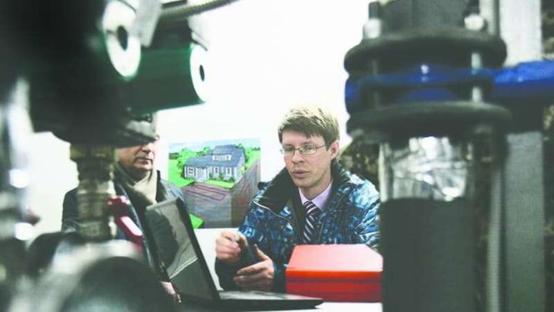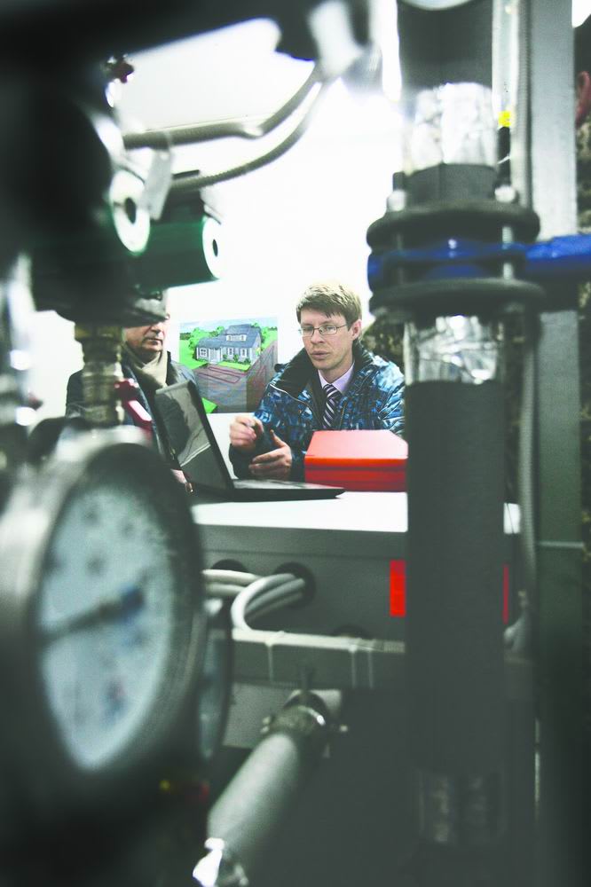 В специальном котловане пробурено более трёх десятков скважин, которые опускаются на несколько метров ниже уровня промерзания почвы. В них заведены специальные трубы. По трубам течёт жидкость, которая сначала попадает в теплообменник, где подогревается до 60 градусов. Уже оттуда тепло распределяется по батареям. На крыше установлены солнечные батареи, они должны вырабатывать электричество и греть воду, которая побежит из-под крана.