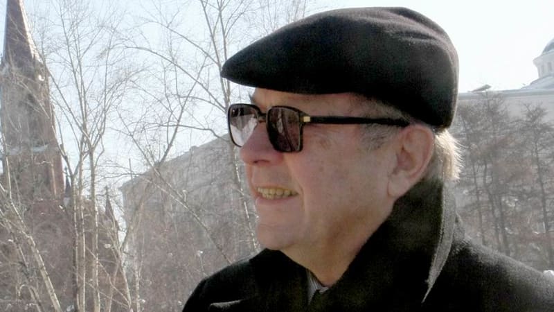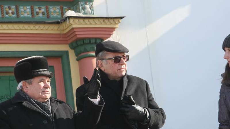 Перед нами белые стены и покой Знаменского монастыря. Узнав, что памятник перед храмом – адмиралу Колчаку, Занусси произносит: