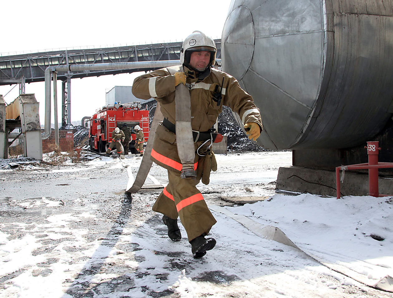 Первыми по тревоге к месту учений прибыли сотрудники пожарной охраны «Иркутскэнерго». Через несколько минут на место происшествия прибыли огнеборцы из второго отряда федеральной противопожарной службы по Иркутской области. По заранее обговорённому сценарию со стихией боролись снаружи и изнутри здания. На поиски людей и тушение отправились шесть звеньев газодымозащитной службы. Вода была подана через три лафетных ствола вверх на горящий конвейер с земли, а также с высоты 50 метров с недавно приобретённой иркутскими пожарными автолестницы, предназначенной для борьбы с огнём в высотных зданиях.
