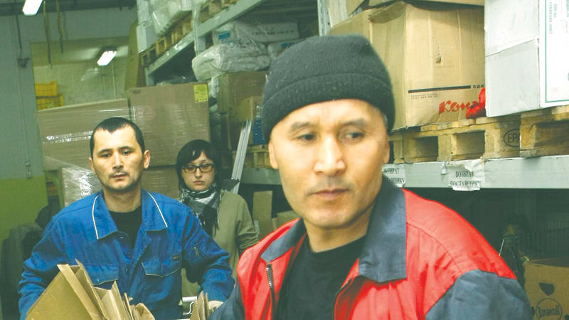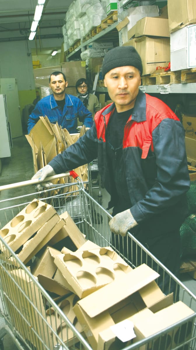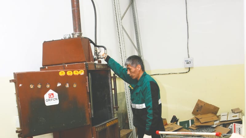 Во многих магазинах «СибЭкоТранс» установил собственные прессы для гофрокартона. Такой мини-цех удалось увидеть и журналистам. Рабочий загружает бывшие коробки и упаковочный картон в автомат, который выдаёт спрессованный тюк в 0,5 кубометра. В «свободном состоянии» эти же отходы заняли бы в десять раз больший объём.