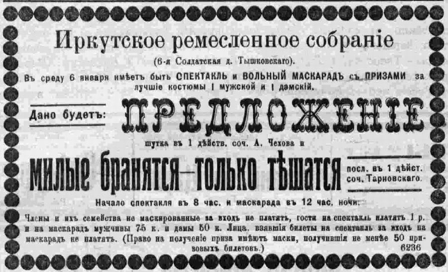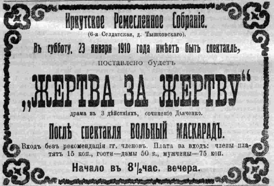 Одновременно с публикацией о его утверждении в «Восточной заре» появилось и весьма характерное рекламное объявление: «В Иркутском торгово-промышленном собрании (угол 6-й Солдатской и Большой, дом Тышковского) ежедневно с 8 часов вечера и до 2 часов ночи игра в лото. Плата за карту от 10 до 25 копеек. Бланки для записи в члены собрания можно получать у эконома».