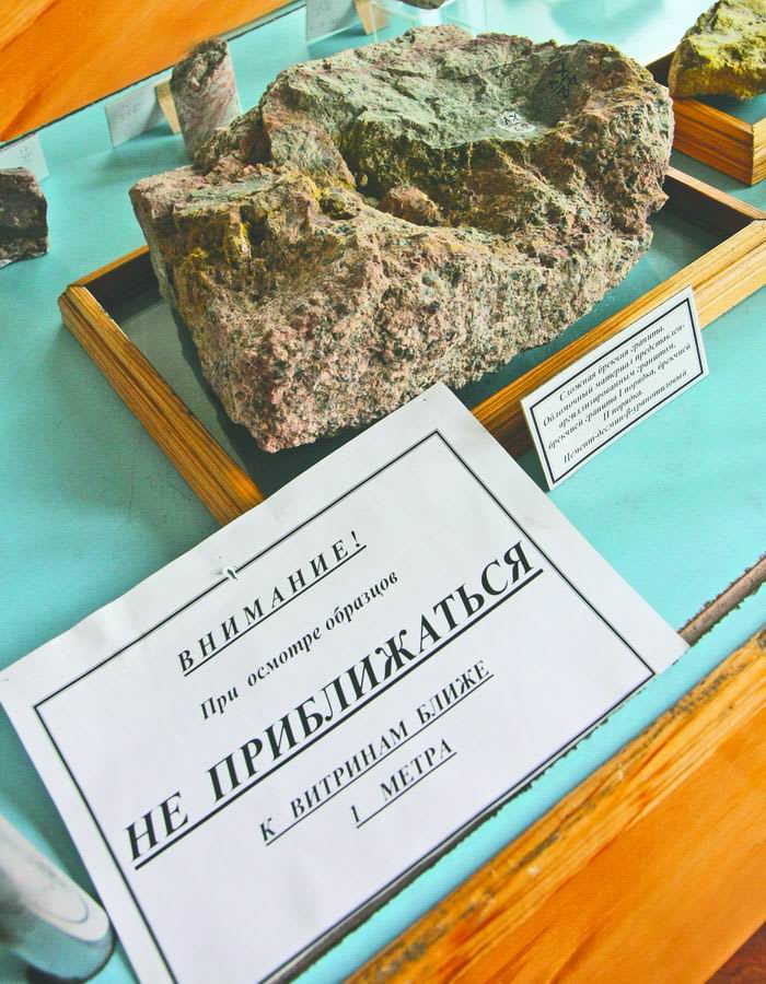 На всякий случай встав на некотором отдалении от них, ровно в центре выставочного зала, наивно интересуюсь, как отреагирует счётчик Гейгера, если его занести в помещение. «Здесь или возле входа не сработает, а поднесёте к тем витринам – затрещит за милый мой», – объясняет мне геолог первой категории Адель Щербо, заведующая музеем. Впрочем, она тут же развеивает все связанные с радиацией опасения, говоря, что помещение в 300 кв. м, в котором размещён музей, было построено и оборудовано с учётом всех строжайших норм техники безопасности: в частности, его оснастили мощной приточно-отточной системой вентиляции, предназначенной для удаления заражённого воздуха. Так что к витринам мы подходим без опаски.