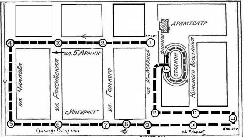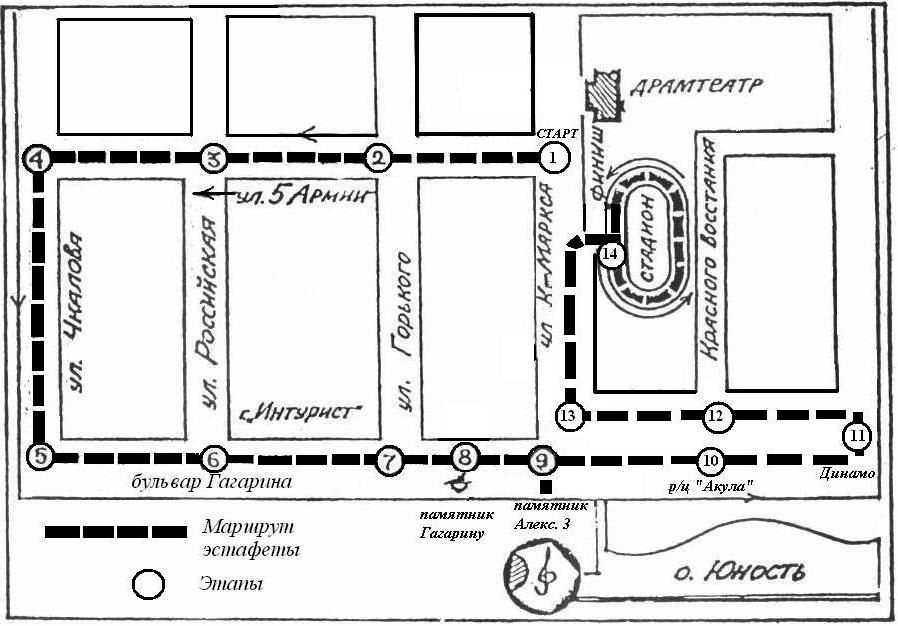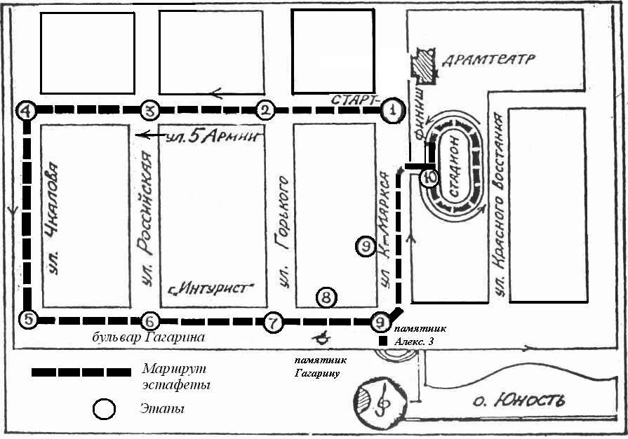Эстафета проводится по улицам города Иркутска (схема прилагается). Старт эстафеты 13 мая в 12.00 у драмтеатра, финиш – на стадионе «Труд». Заседание судейской коллегии состоится 10 мая в 16.00 на стадионе «Труд».