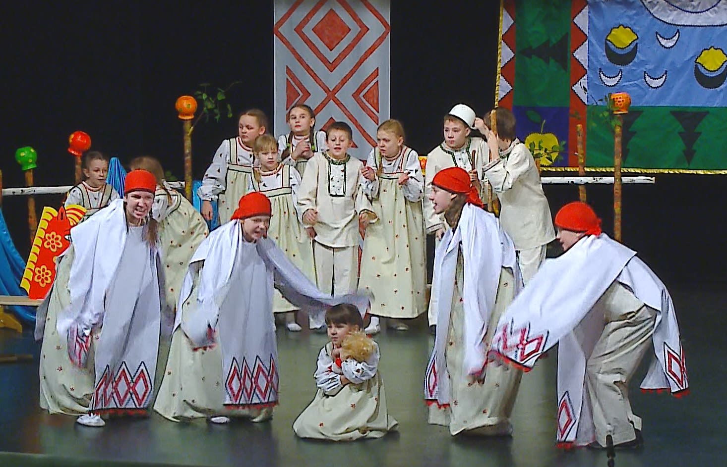 графия рождалась вместе со спектаклем. А его постановочная идея, идея Магидина – в детской игре. Вот деревенские ребятишки, оторвавшись от своих дел (прокатать холсты, просеять зерно, просто побегать), играют свою любимую сказку. И, как в детской игре, всё идёт в ход. Лоскутное одеяло становится печкой, глиняные горшки – яблоками, холсты – крыльями и волнами речки, мётлы и скамейки – избушкой Бабы Яги. Для этих детей естественно танцевать в хороводе, выходить в круг, играть в «змейку» и «воротца». Гуси должны быть сердитыми, грозными даже, нечистая сила – смешной, лошадки – задорными. Отсюда и хореография постановки. Отсюда и костюмы, декорации. Опера, конечно, авторское, режиссёрское произведение. Однако невозможное без команды.
