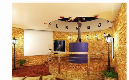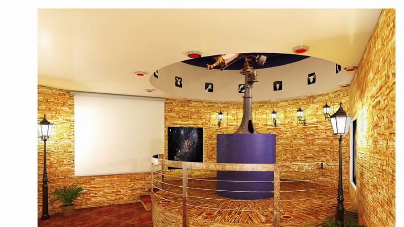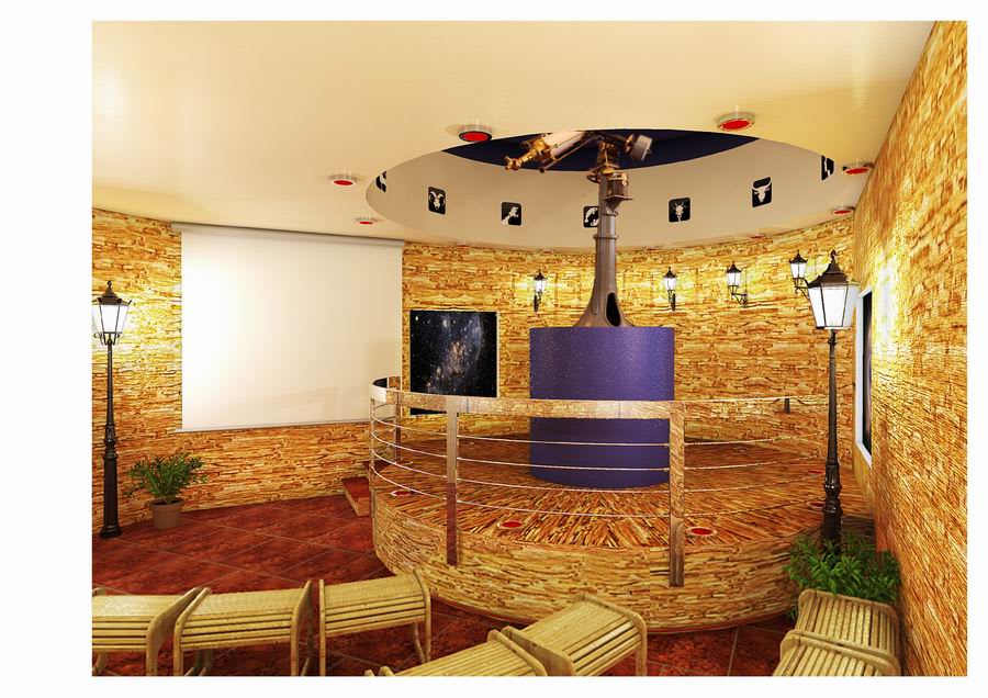 Стены обсерватории будут отделаны «рваным камнем», внутри поставят и развесят декоративные уличные фонари и бра-фонарики на стенах, скамеечки. «Человек должен почувствовать лёгкую идентичность антуража прогулочных улочек 130-го квартала, – говорит Виктория Астраханцева. – Купол изнутри покрашен в тёмно-синий цвет, имитирующий бездну тёмного звёздного неба. По кругу разместятся изображения двенадцати созвездий Зодиака, а под ними будет нанесён график, отражающий, сколько времени на самом деле проводит Солнце «на территории» каждого из созвездий, ибо светило гостит в разных созвездиях по-разному. На стенах – подсвеченные изнутри сюжетные картины: виды Млечного пути, галактик. Как только зрители освоятся в новом помещении, их ждёт сюрприз. Обычный свет погаснет, на мгновение все окажутся в полной темноте, а затем поочерёдно начнут загораться красные светильники, по кругу вмонтированные в пол и потолок, возникнет эффект вертикальных световых лучей, как будто люди видят космический корабль».