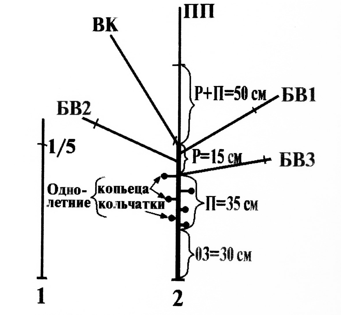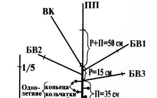 На основании полученных данных весной следующего года вырезается до основания (на кольцо) ветвь-конкурент (ВК), имеющая острый угол отхождения – менее 45 градусов. Побег продолжения ПП (центральная однолетняя ветвь) обрезается на длину 50 см от основания, т.е. на сумму длин зон роста и плодоношения (Р + П = 15 + 35 = 50 см), с тем чтобы к осени текущего года кольчатки образовались от самого основания ветви. Боковые ветви (с углом отхождения 60–80 градусов) обрезаются несколько меньше, чем проводник (центральная ветвь). Причём чем больше угол отхождения (угол между боковой и центральной ветвями) у боковых ветвей, тем несколько меньше они укорачиваются, т.к. кольчаток у них образуется больше, а ростовых побегов меньше, чем у центральной (вертикальной) ветви. Поэтому первую боковую ветвь (БВ1) надо обрезать примерно на 52 см от основания, вторую боковую ветвь (БВ2) – примерно на 55 см, а третью боковую ветвь (БВ3), имеющую угол отхождения, близкий к 90 градусам, можно и не обрезать, но лучше слабо укоротить (на 1–3 см сверху), чтобы убрать верхушечную почку. Тогда больше образуется кольчаток.