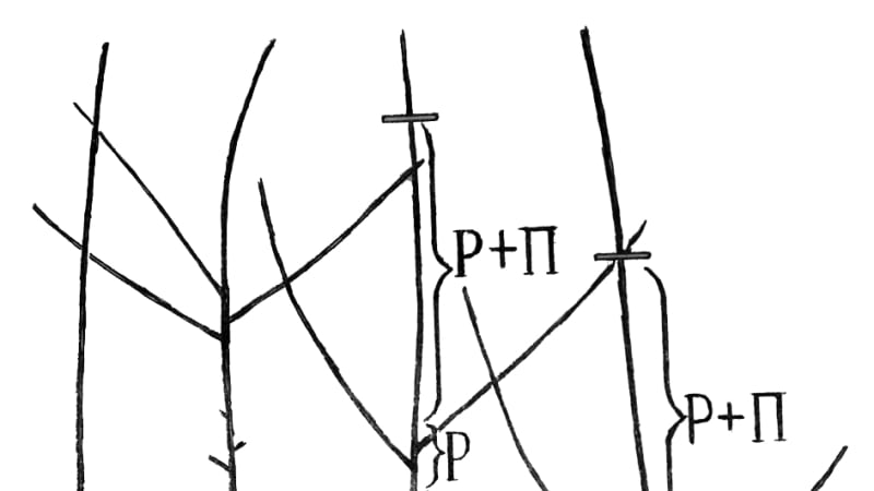 На нём 1 – однолетняя ветка, которую весной собрались обрезать. Величина обрезки в этом случае больше, 1/4. Места обрезки везде отмечены чёрточками. 2 – двухлетняя ветвь, выросшая к осени после указанной обрезки. На ней сформировались ростовые побеги (Р – зона роста); копьеца и  кольчатки (П1 – зона плодоношения); спящие почки (ОЗ – оголённая зона). 3 – трёхлетняя ветвь. Ей весной следующего года сделали обрезку на нижнюю боковую ветвь (БВН) – заметьте, уничтожили большую часть ростовой зоны Р вместе с приростом и укоротили эту боковую ветвь на сумму длин П1+Р. К осени на ней выросли: ростовые побеги (Р2 – новая зона роста); копьеца и кольчатки на двухлетней ветви (П2 – зона плодоношения); кольчатки в прошлогодней оголённой зоне (П2а) трёхлетней ветви.