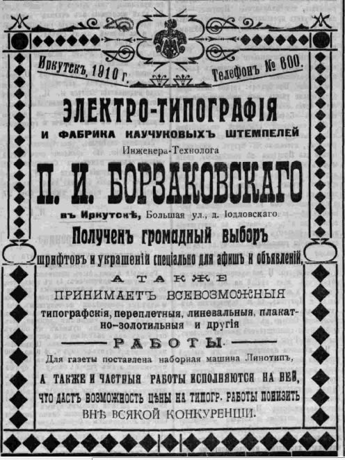 «Какие ж они, однако, наивные, – усмехались в типографии Борзаковского. – Надо ведь делать скидку и на местные, ссыльнокаторжные нравы…» Однако и не склонный к иллюзиям Борзаковский сам попал впросак, доверившись заведующему электростанцией Ясинскому и городскому инженеру Лятур. В начале сентября типография Борзаковского абонировалась на городской электрической станции и заказала ток в 115 вольт как наиболее подходящий для типографских машин. Но в действительности напряжение оказалось значительно выше – и моторы едва не вышли из строя.