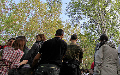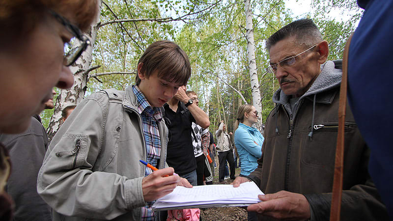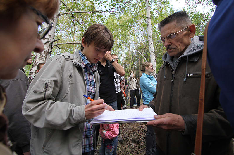 Жителям посёлка Ново-Иркутский определённо повезло: дома стоят прямо на границе леса Академгородка, а до города – считанные минуты. Единственная улица, вдоль которой стоят 50 домов, упирается в небольшой стадион и спуск в парковую зону. Вечером 31 мая жители собрались там, чтобы публично протестовать против расширения коттеджного посёлка и вырубки леса. Официально мероприятие называлось «субботник». В роще столпились человек двести, многие со значками «Защитим лес Академгородка». Сколько человек в инициативной группе, её участники точно сказать не могут: на борьбу за лес они организовались стихийно. Неформальный лидер активистов Наталья Коньшакова разрывается между журналистами и соседями. Просит оставлять координаты тех, кто готов «вести активную работу». Затем машет в сторону, где уже огорожен участок и вырублены деревья.