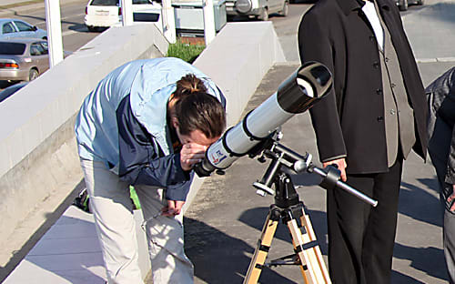 Девять утра. За ручку ведут сосредоточенного молодого человека лет пяти по имени Кирилл. До окуляра Кирилл не дотягивается, папа держит его на руках, пока тот заглядывает. «Видишь, эта чёрная точка – Венера!» – говорит мама. Кирилл полусонно, но весьма солидно кивает: «Ага». «Ты-то у нас, может, доживёшь, – говорит папа. – А нам с мамой будет по 136 лет, когда она второй раз придёт». Днём телескопы стояли уже низко-низко, так что важные люди 2-3 лет от роду могли сами подойти и удостовериться: Венера – она есть. Взрослые снимали картинку в окуляре на фотоаппараты и мобильники. Особенно всем нравилось, когда с телескопа снимали фильтр и кружочек Солнца с ровной круглой точкой с окуляра проецировался на лист бумаги. Ближе к середине дня к музыкальному театру прибыла делегация ангарчан, которые специально для наблюдения за Венерой отправились в Иркутск. «Я тут охранником работаю в музыкальном театре, как раз сменился, а по «АИСТу» говорят, здесь телескопы будут, – подходит мужчина и робко заглядывает в окуляр. – Вот как хорошо, ладно как! Это когда теперь приходить? Через 105 лет? Ну, я подойду обязательно».
