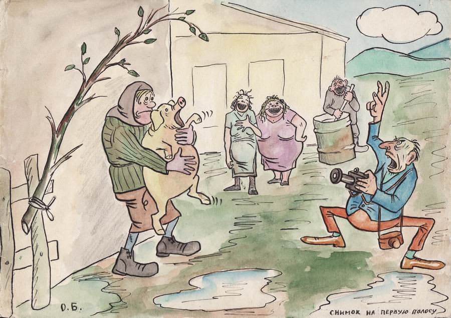 Когда я пришёл в редакцию, меня, знающего, «почём улыбка художника?» (шутка Валеры Кашевского), сразу же определили в редколлегию «Журналиста» – так называлась наша стенная газета, длина которой в среднем доходила до 5-6 метров. В одном из первых же выпусков «Журналиста», посвящённых какой-то праздничной дате, я воздал дань своему старшему другу Василию Яковлевичу Лысенко. Его имя тогда было названо среди победителей международного фотоконкурса. Я нарисовал дружеский шарж «Снимок на первую полосу» и присочинил стихи (начало не помню):