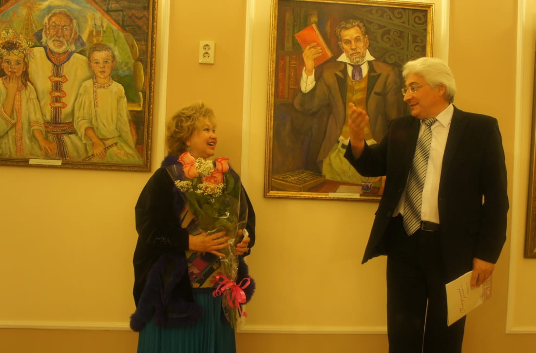 Слова признательности и благодарности художнице высказали герои её картин – заслуженные артисты России, ведущие мастера сцены Галина Проценко, Любовь Почаева, Валерий Елисеев. Валерий Алексеевич, к примеру, изображён на полотне с двумя внуками.