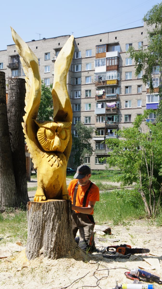 Первой на это предложение Сергея Зиннера откликнулась директор УК «ЖЭУ-6» Светлана Хамируева. Работы в 11 микрорайоне скульптор начал в середине мая – тогда на четырёхметровой высоте появился «Чижик-пыжик». Вернулся во двор дома № 5 мастер в июне, после завершения фестиваля деревянной скульптуры «Лукоморье» в Савватеевке.