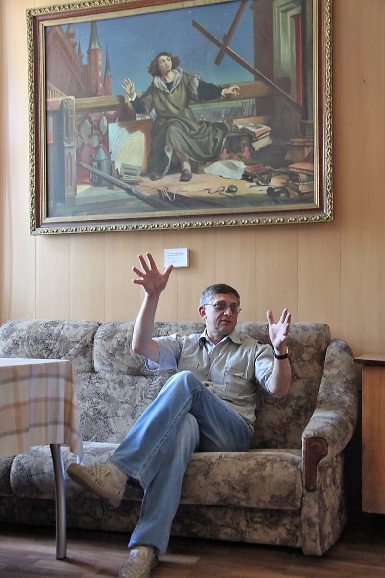 – В полукруглые ниши храмовых стен вписывались «Сожжение Джордано Бруно» и «Суд над Галилеем». Писаны они, думаю, в конце 1940-х годов – планетарий в помещении церкви был открыт в 1949-м. В советское время, конечно, был особый смак заниматься атеистической пропагандой в старых храмах. Но и чисто технологически – для планетария нужен высокий потолок – купол в Троицкой церкви идеально подходил: для диаметра купола восемь метров нужно было помещение с высотой почти шесть метров. И такая ситуация была почти по всей стране. Не случайно мы потом начиная с 1992 года никак не могли найти помещение под планетарий в Иркутске. Сейчас эти совершенно несовременные произведения висят в коридоре обсерватории и тоже сохраняют определённый дух.