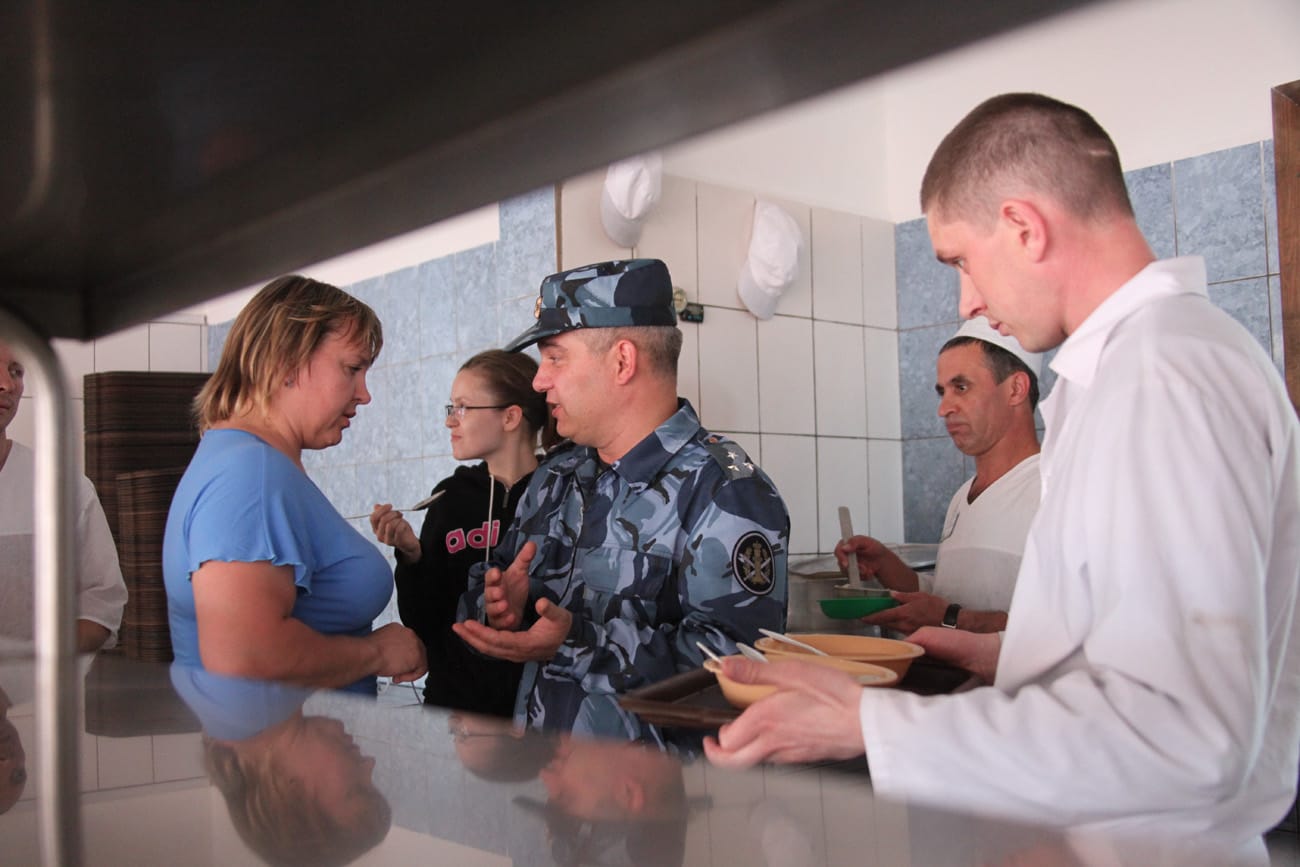 После проходной, защищённой бронированным стеклом, посетителей, среди которых известная визитёр и чемпионка мира по тяжёлой атлетике Альбина Хомич, ставшая для «Иркутского репортёра» проводником в уголовно-исправительную систему, встречает большая асфальтированная площадка. Ни соринки, в глаза бросается сверкающий храм на пять куполов, а прямо перед входом идёт строительство деревянной церкви по заказу Иркутской митрополии. В ИК-19 обширная православная община. На Пасху в храме не продохнуть. Есть среди заключённых шаманисты, а исламистам с примерным поведением разрешают делать намаз. По левую руку от входа располагается промышленная зона, прямо по курсу – столовая и киноконцертный зал «Кедр», справа – жилая зона в десять отрядов, медсанчасть и кафе «Уют». Из инноваций – прозрачные ящики для обращений заключённых. «Мне не надо постоянно в них заглядывать, сразу видно, пустые они или нет», – поясняет Бородай. «Удобно, надо нашим в «двойке» (ангарская ИК-2. – Авт.) посоветовать», – соглашается Альбина Хомич.