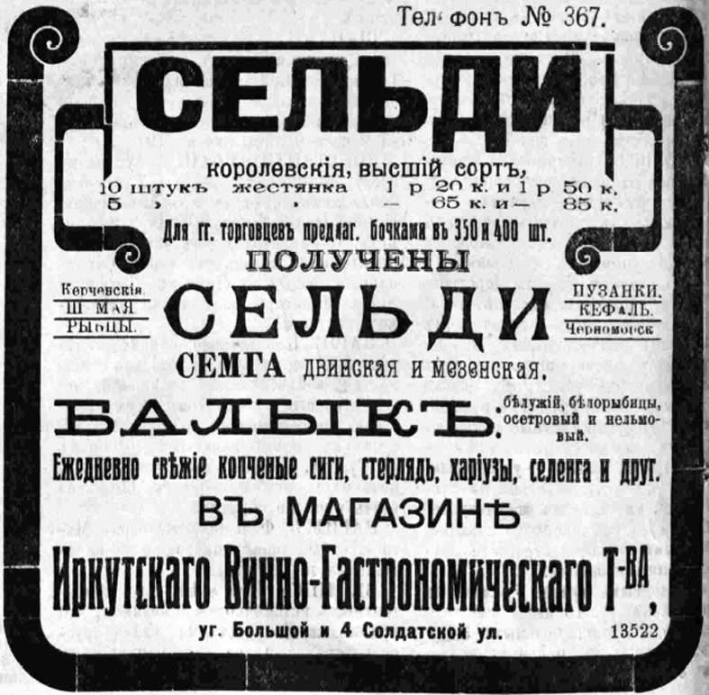 А самой народной едой в Иркутской губернии считался омуль, и во всякие времена начальники края следили, чтобы цена на него не поднималась выше 1-2 копеек за штуку. До девяностых годов девятнадцатого века это удавалось вполне, затем цены начали колебаться, подскакивая порой до 7 копеек, и в январе 1908 года по настоянию генерал-губернатора в Иркутске открылся съезд рыбопромышленников и представителей населения. Он работал две недели и вызвал у всех чувство удовлетворения. Прежде всего тем, что рыбопромышленники признали ведение промысла хищническим и сами ходатай-ствовали перед генерал-губернатором о запрещении рыболовства во время нереста.