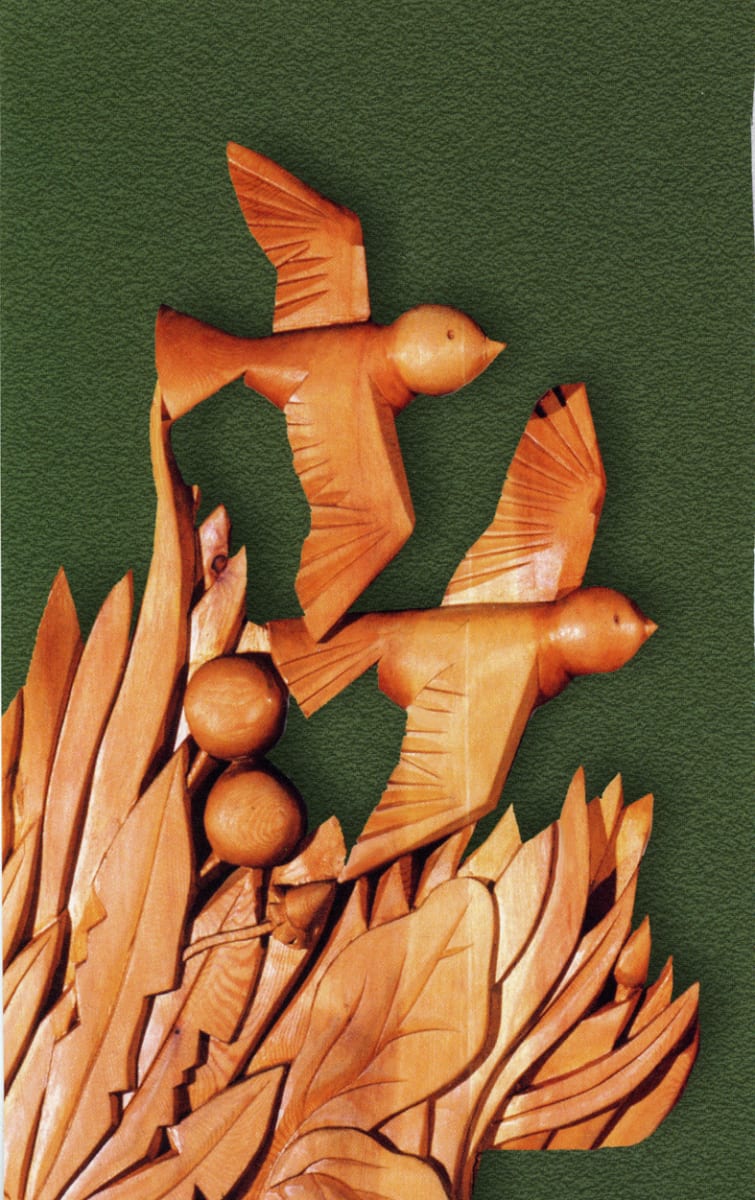 Большое место на выставке уделено декоративно-прикладным работам. Резьба по дереву впечатляет настолько, что обыденное становится необыкновенным. Прорези на досках могут располагаться так, что видятся в них зимняя вьюга, завируха или весна. Грандиозное впечатление производит доска, названная художником «Иней». Дерево – материал природы – Огиенко только подправил, прошёлся резцом по жилам –  кольцам жизни, подтонировал, сделал поперечные полосы, и вот  образ причудливого  рисунка готов.