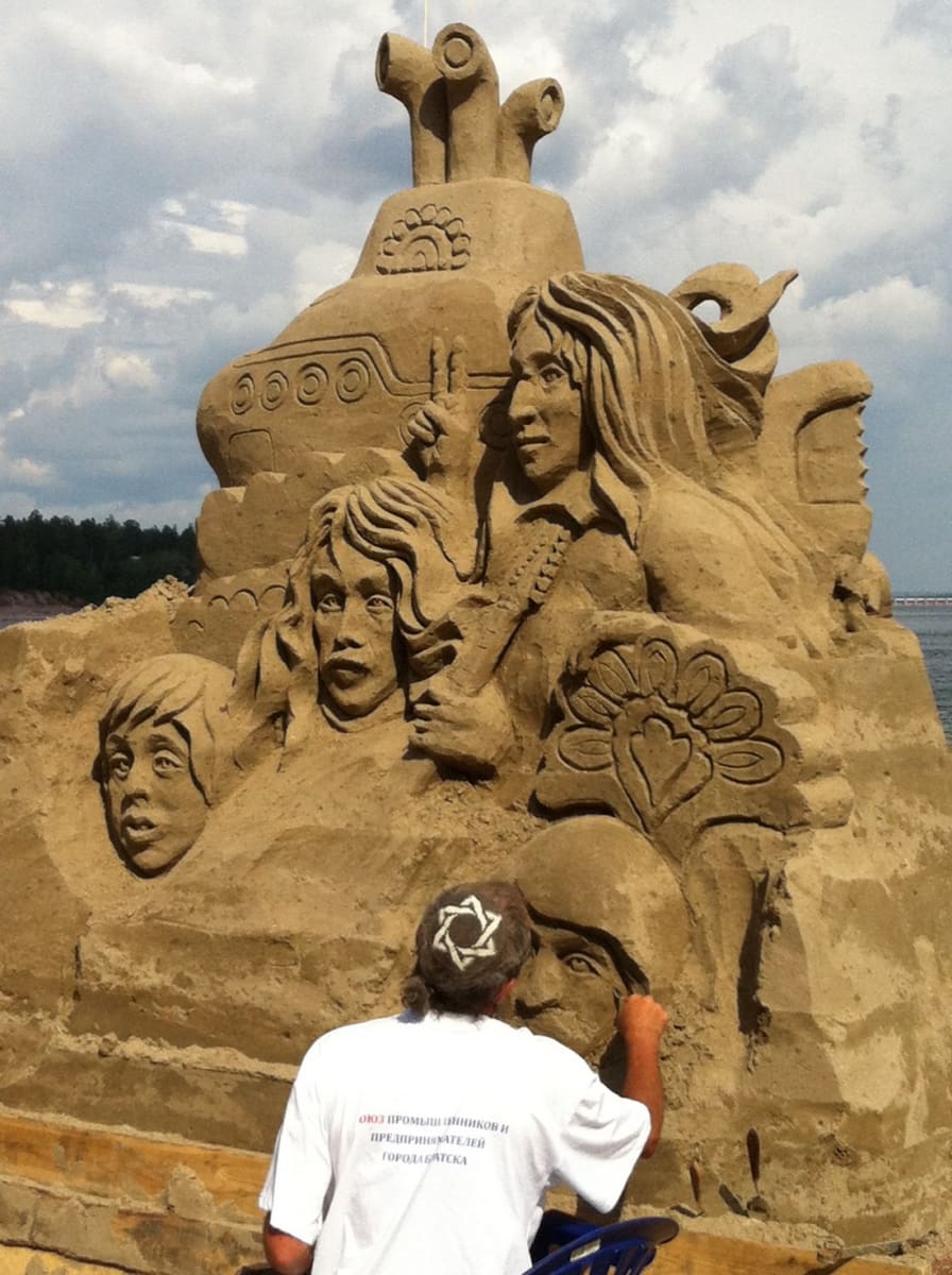 Организаторы – творческая группа «Счастье своими руками» – художников в темах не ограничивала. Вот «Жёлтая подводная лодка» (работа ангарчанина Сергея Зиннера) с потртретами всех четырёх музыкантов группы «Beatles». Субмарина заплыла в Братское море по случаю юбилея: 6 июля битломаны отметили 55-летие со дня рождения легендарной ливерпульской четвёрки. Круглые очки на лице Джона Леннона стали «образом-вампиром» – после их появления зрители перестали обсуждать, похожи ли песчаные битлы на своих прообразов: всех интересовало только то, как удалось сделать оправу из песка.