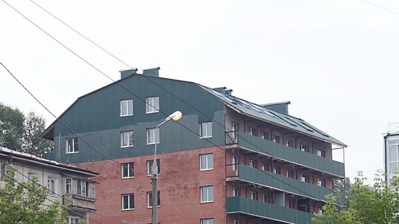 Этот дом виден издалека: среди трёхэтажных построек советских времён жилой дом в семь этажей с ярко-зелёной крышей заметен сразу. Но чем ближе подходишь к новостройке, тем отчётливее видны недоделанные балконы, прикрытые каким-то материалом вместо стёкол окна, вокруг дома гравий, по которому достаточно сложно передвигаться. Во дворе стоит специфический запах канализации: выгребная яма прикрыты фанерными листами. Ни о какой детской площадке и благоустроенной территории и речи нет. Несмотря на всё это, в самом доме жизнь кипит. Из окон слышится смех, на бельевых верёвках сушатся детские вещи, под окнами стоят автомобили.