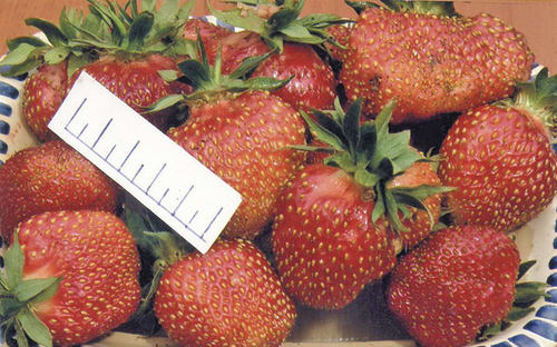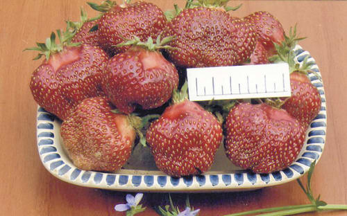 Сорт Берегиня нынче оказался просто лидером по урожайности. Он настолько поразил меня ещё в период цветения, что я провела оценку кустов двух- и трёхлетнего возраста. Урожай в миллилитрах составил 3100 и 2900 соответственно. Этот рекордсмен, включённый в Госреестр по Центральному региону, отличается небывалой зимостойкостью и выносливостью. Его кусты первыми оправились после весенней кутерьмы и буквально поразили обилием цветоносов – порядка 20. На каждом из них созревало по 2-3 крупные (до 30 г) ягоды – красные, плотные, сочные со вкусом лесной земляники. Остальные ягоды помельче, но такого же товарного вида. Словом, есть чем полакомиться и заготовки сделать впрок. Кстати, толчённая с очень малым количеством сахара земляника в морозильнике сохраняет чудесным образом цвет, вкус, аромат свежих ягод. Данный сорт широкого назначения также щедро одаривает усами. Но этот «грех не так большой руки», лишь стоит садить кустики на узкие грядки, и все усы будут в меже.