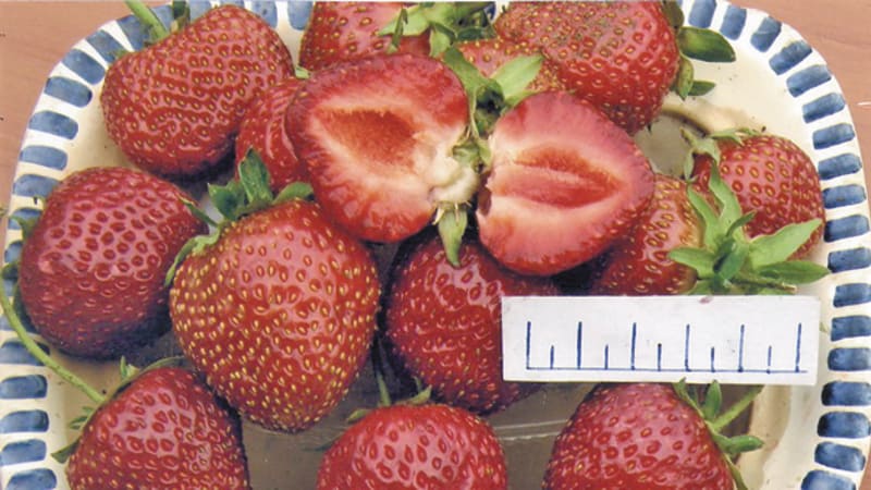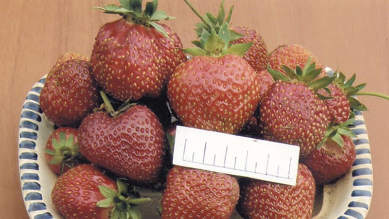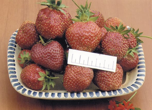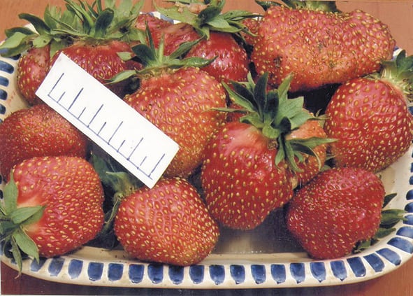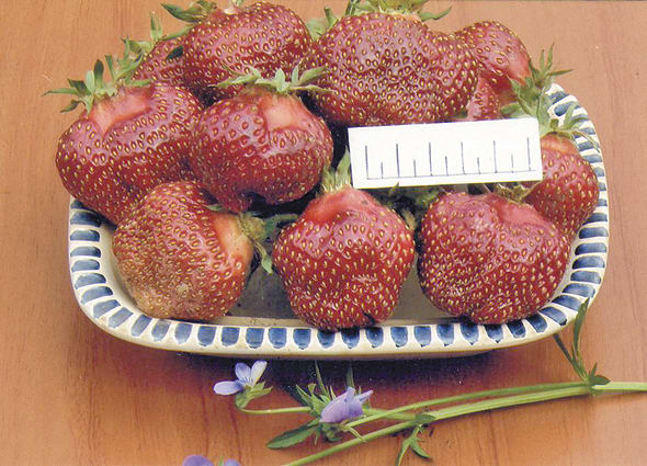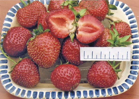 Сорт Берегиня нынче оказался просто лидером по урожайности. Он настолько поразил меня ещё в период цветения, что я провела оценку кустов двух- и трёхлетнего возраста. Урожай в миллилитрах составил 3100 и 2900 соответственно. Этот рекордсмен, включённый в Госреестр по Центральному региону, отличается небывалой зимостойкостью и выносливостью. Его кусты первыми оправились после весенней кутерьмы и буквально поразили обилием цветоносов – порядка 20. На каждом из них созревало по 2-3 крупные (до 30 г) ягоды – красные, плотные, сочные со вкусом лесной земляники. Остальные ягоды помельче, но такого же товарного вида. Словом, есть чем полакомиться и заготовки сделать впрок. Кстати, толчённая с очень малым количеством сахара земляника в морозильнике сохраняет чудесным образом цвет, вкус, аромат свежих ягод. Данный сорт широкого назначения также щедро одаривает усами. Но этот «грех не так большой руки», лишь стоит садить кустики на узкие грядки, и все усы будут в меже.