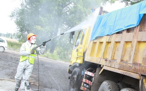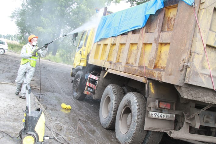 И если посетителям разрешены послабления, то для работников, наоборот, действуют гораздо более жёсткие правила безопасности, которые делают их похожими на ликвидаторов масштабных экологических катастроф. «Проектом предусмотрены маски-«лепестки», но мы пошли дальше и применяем современные респираторы с полным улавливанием пыли, ведь самое главное – защитить органы дыхания. Костюмы химзащиты тоже не требуются, но мы их используем, – рассказал генеральный директор подрядчика ООО «Сиб-Транс-Петройл» Игорь Анбросенко. – В конце смены все работники проходят обеззараживание – в душе обмываются известковым «молоком», а потом водой». За вредность они получают молоко. То же самое, за исключением выдачи молока, происходит с грузовиками, которые транспортируют отходы. На выезде люди в костюмах химзащиты их обливают, как в автомойке. Когда изморось долетела до журналистов, они нервно отшатнулись. «Это просто вода. Обычная трубопроводная вода. Не бойтесь», – успокоил мэр.