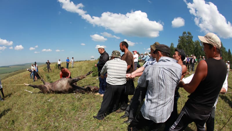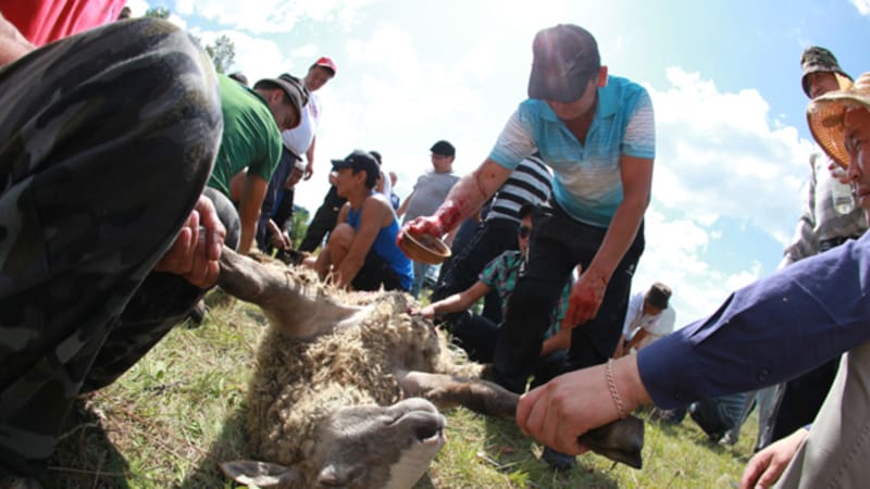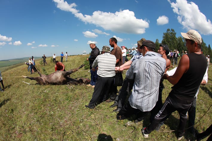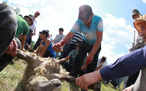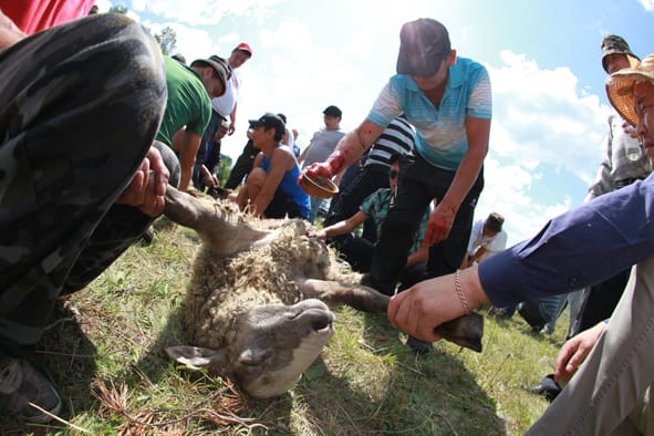 Обряд начинается с жертвоприношения. Бараны лежат на траве, сохраняя тупое спокойствие. Конь бьётся: он чувствует. Говорят, от Тарасы его в гору тянули трактором – не хотел идти. В начале обряда есть что-то варварское, кровавое. По правилам приношения живому коню рассекают брюшину и рукой обрывают аорту. Говорят, это безболезненная и почётная смерть. Во время обряда никому не дозволено касаться коня, кроме шамана и того, кто приносит его в жертву. В это время они высказывают почтение коню, просят у него прощения и молятся, капая из чаши на морду и выпивая остатки тарасуна. После жертвоприношения это позволяют сделать всем, кто хочет отдать почести жертвенному животному. Даже «Иркутскому репортёру».