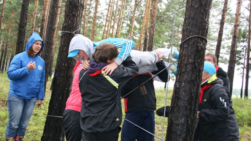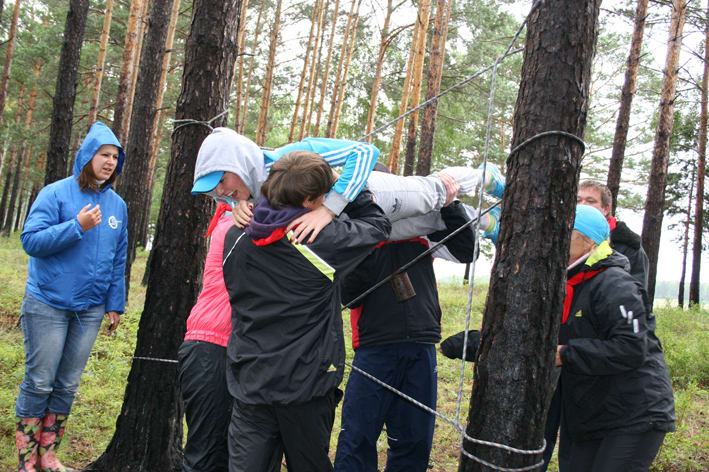 18 августа. Как ни пыталась погода с дождём и порывами ветра испугать туристов, ей это не удалось. Они проснулись под звуки горна. Нет плохой погоды, есть хорошая тёплая одежда и обувь, а главное – настроение побеждать! Зарядка, горячий завтрак с традиционной солдатской кашей, бутербродами и кофе. Организационное построение с разбивкой на команды. Принадлежность к каждой команде определяют разного цвета галстуки-банданы. Капитаны озвучивают на ходу придуманные названия и девизы команд. Спортивная часть туристического слёта началась с прохождения полосы препятствий. Туристы ползали, бегали, пролезали, пролетали. Их проносили, проталкивали, они шли с завязанными глазами, волокли тяжёлый брус, захватывали разбросанные камни, переставляли пирамиды.