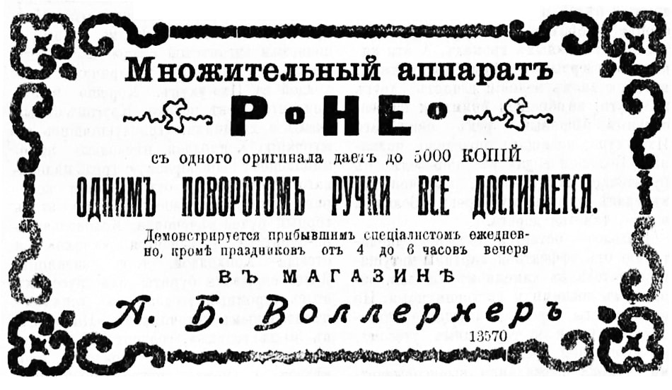 – Представьте: получаю я нынче каталог по Варшавской губернии, а он с первой и до последней страницы посвящён изделиям из «кудрявой» стали. Ей-ей, скоро и заурядный амбар будут ставить из волнистых желез в угоду техническому прогрессу, – иронизировал владелец крупного магазина Воллернер. Однако ж и сам выписал из столицы специального консультанта, представлявшего современный множительный аппарат, и ежедневно от четырёх до шести часов вечера тот рассказывал и показывал, как «одним поворотом ручки получить до 5 тысяч копий с одного документа». Для большего эффекта тиражировались кулинарные рецепты, и довольные обыватели с удовольствием запасались экземплярами для родных и знакомых. Так что и в гостиной у протоиерея Фивейского оказался этот рекламный листок.