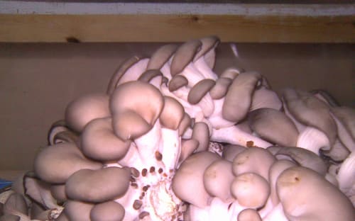 Готовые блоки помещаются в инкубатор. Это тёмная и тёплая комната, где заготовки «живут» до полного зарастания, обычно 20–25 дней. Блок становится белым, следовательно, первые грибочки уже спешат вырваться наружу. «Бочонки» выносят в теплицу, атмосфера в которой максимально приближена к осеннему лесу: температура не выше 15 градусов, оптимальная влажность достигается регулярным опрыскиванием пола, ощущение лёгкого ветерка обеспечивает вентиляция. Отклонение от заданных параметров тут же сказывается на плодоношении. Если в теплице душно, то у грибов удлиняется ножка и становится меньше шляпка. Чрезмерное понижение температуры (ниже восьми градусов) замедляет рост плодовых тел. После того как грибница отработала, то есть выдала весь урожай, её утилизируют. Примечательно то, что хозяйство не имеет отходов – использованные блоки очень питательны, и их с большим удовольствием съедают местные свиньи.