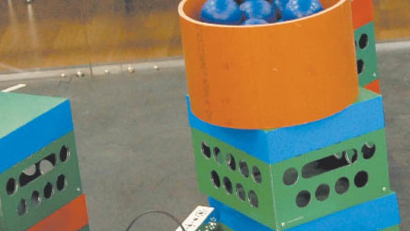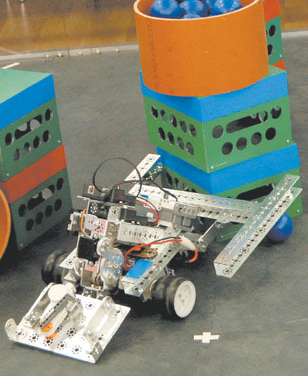 «Но наш робот не покажет этого задания, – довольно неожиданно сообщил студент пятого курса НИ ИрГТУ Пётр Лукин. – Мы собрали тестовую модель, чтобы показать, как он может просто тупить». Само собой, подготовленные для соревнований роботы способны на большее, но в опытный образец заложена только базовая программа, не учитывающая многих факторов, которые могут возникнуть на игровом поле. Так что в автоматическом режиме она работает лишь 30 секунд, однако есть возможность и ручного управления. Но кое-что она умеет: съехавший с помоста робот останавливается перед пластиковой стенкой, не доехав до неё нескольких сантиметров, разворачивается и едёт в противоположном направлении. Здесь он, правда, застревает на крутом пандусе, для преодоления которого не хватает мощности маленького электродвигателя. «Ультразвуковой датчик не даёт ему прижаться к препятствию, – поясняет Лукин, проводя перед «глазами» аппарата рукой, так что тот разворачивается и вновь выезжает на поле. – По мере возможности. То есть, если перед ним махнуть рукой, он отъедет». Робот между тем выполняет то, что от него требовалось, – сбивает ящик с шариками. А второй аппарат, которым управляют вручную, довершает начатое и закатывает их в «ворота».