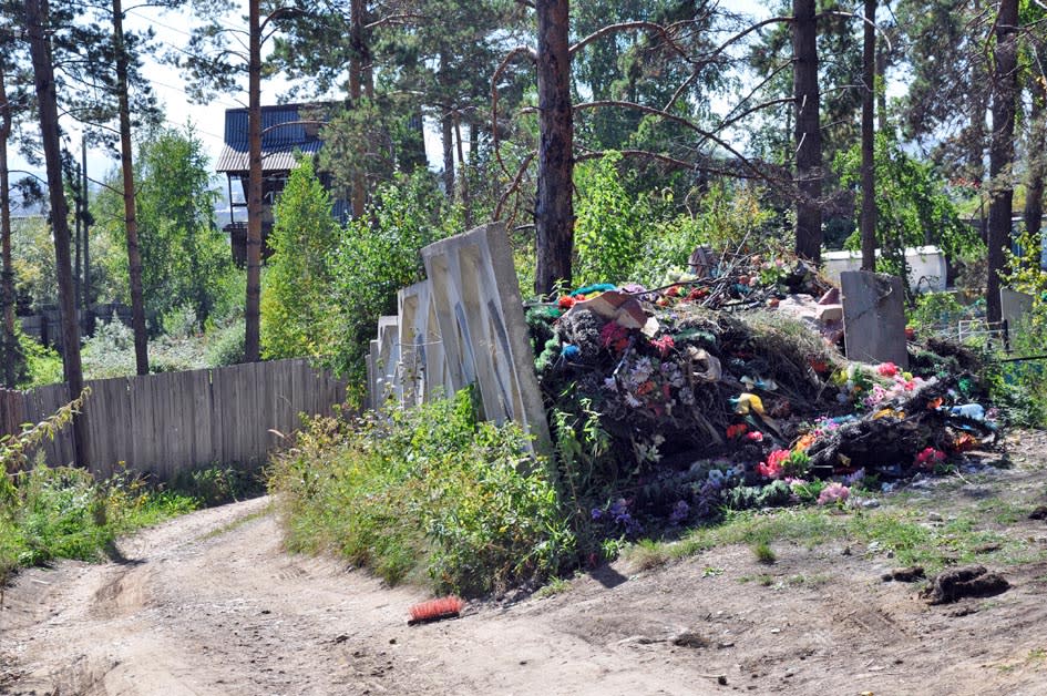 От гор кладбищенского хлама страдают все. На подъезде к переулку стоит бетонная стена в рост человека, которая раньше, видимо, загораживала мусорные контейнеры. Под тяжестью постоянно складируемых металлических надгробий-«тумбочек» и поблекших искусственных венков она накренилась так, будто вот-вот рухнет. Та же картина на обочине дороги: сюда давно сбрасывают остатки кладбищенского убранства, и мусор просто валится вниз под гору. Всего в переулке Таёжном стоят семь домов. Периодически, особенно после пикового родительского дня, их жильцы пытаются наводить порядок сами и просят приезжающих родственников увозить мусор с собой, но проблемы это не решает.