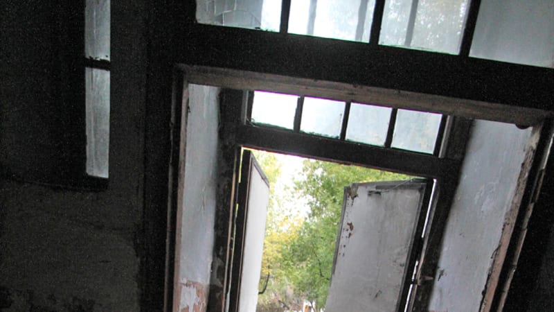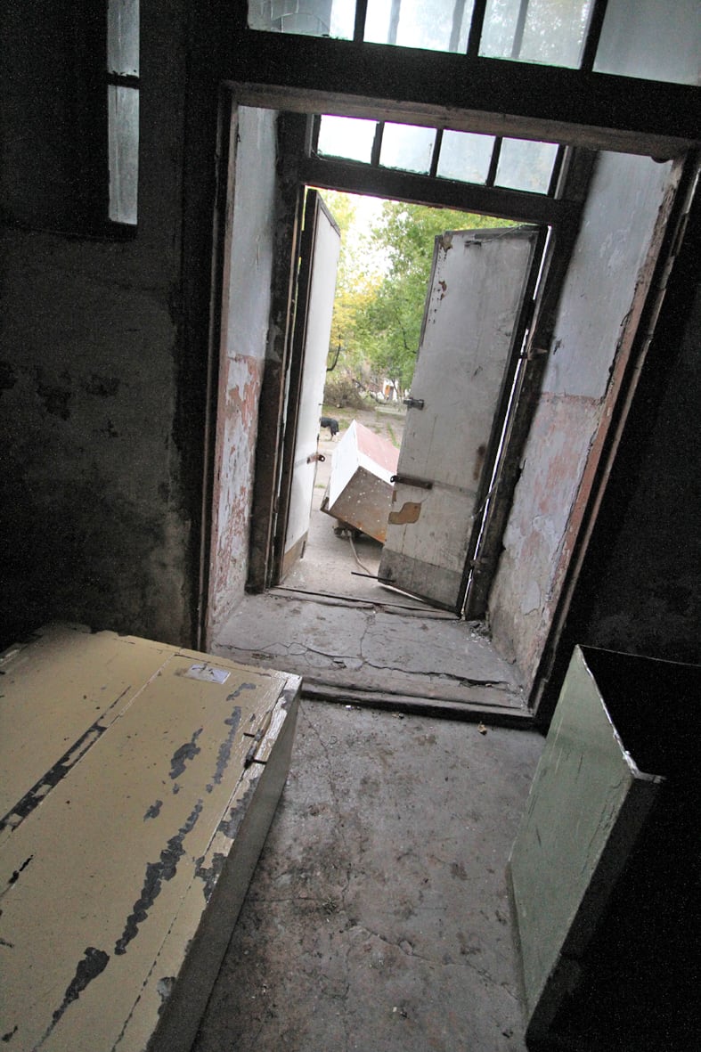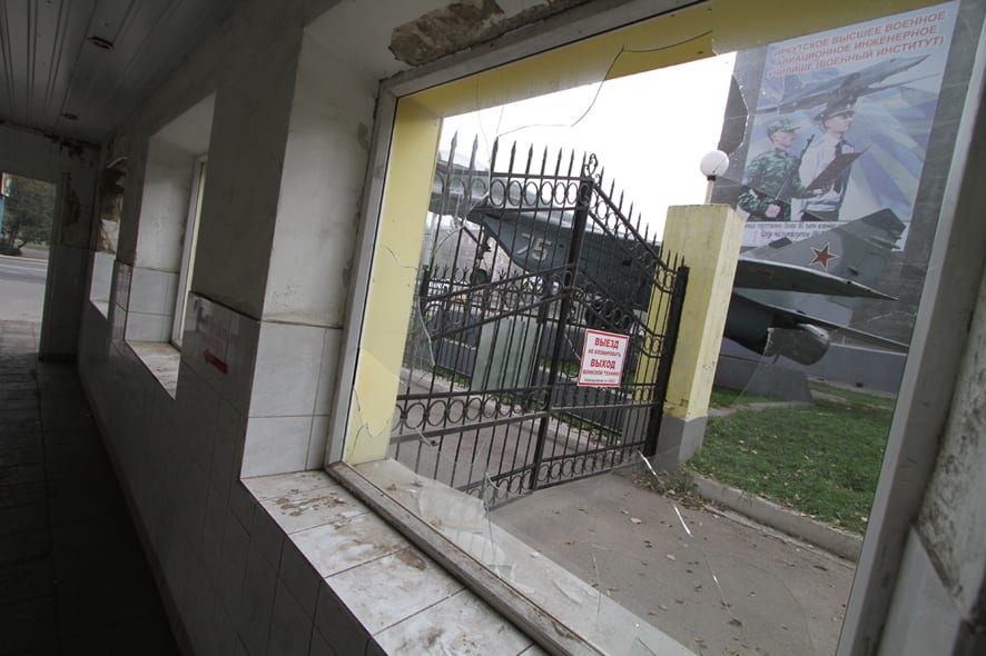 «С учебного аэродрома везут аэродромные плиты. Есть свидетели, которые видели, как две машины вывезли, и это только то, что замечено. У нас, где я живу, рядом с санчастью, люди не стесняются, днём приезжают на машине, что-то грузят. Весь же город знает, что всё брошено. Вот, смотрите, вход в учебный корпус. Не охраняется, всё открыто, стёкла разбиты. Это, кстати, наш бывший четвёртый факультет радиоэлектронного оборудования. Народ из соседних домов жалуется: виден по ночам свет фонариков, что-то пилят, грузят. Срезают решётки, даже рамы сняли. Если смотреть на моей кафедре, там всё уже подчищено: батареи, провода. Видите, куда это приготовили? Очевидно, на металл», – констатирует Андрей Чигвинцев. У наших ног на пороге одного из входов криво лежит брошенный сейф в рост человека. Рядом с ним валяется ещё один, поменьше.