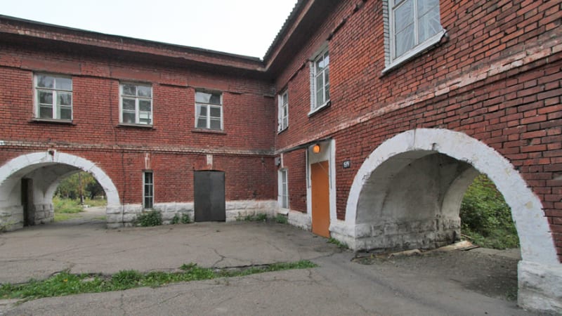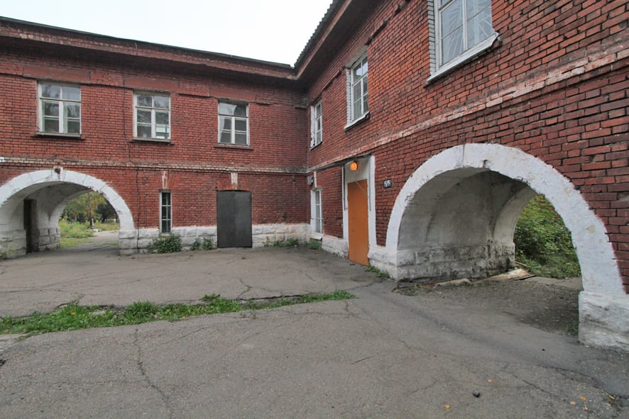 На экскурсию по городку «М2» от-правился с бывшим начальником одной из кафедр ИВВАИУ, полковником запаса Андреем Чигвинцевым. Через пустой контрольно-пропускной пункт с разбитым стеклом проходит много людей, но в военной форме среди них нет никого. Оживление исчезает, стоит продвинуться чуть дальше за КПП. Тишину и запустение бывших учебных корпусов тревожат только собаки, а внешний вид зданий и прилегающих территорий даёт ощущение полной заброшенности. Обход территории начался с осмотра здания, построенного в начале прошлого века.
